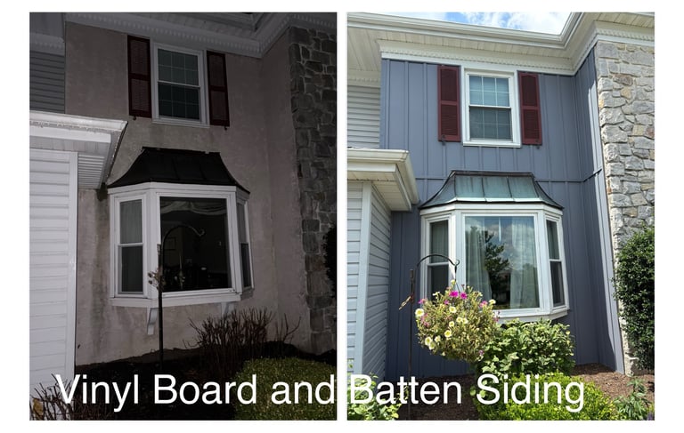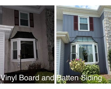 This before-and-after photo showcases a dramatic exterior home makeover. On the left, you see the original stucco and siding. The right photo reveals a complete transformation using vinyl board and batten siding, which adds a modern, vertical dimension and a fresh new color. This project not only enhances the home's curb appeal but also provides durable, low-maintenance siding that will last for years.