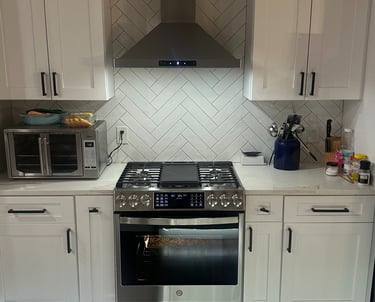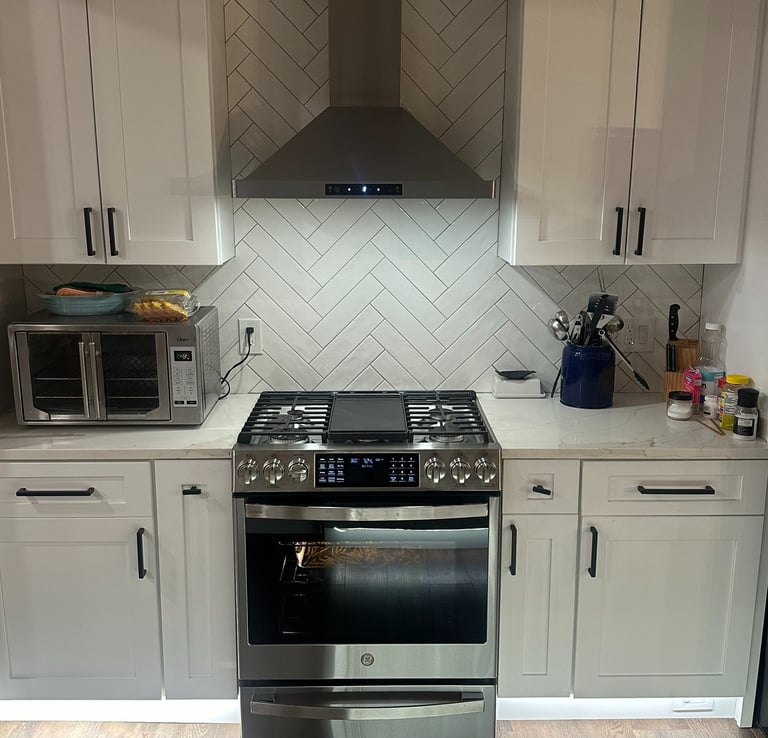 This project highlights a striking kitchen transformation focused on the area above the stove. We installed a sleek herringbone tile backsplash, adding a sophisticated and modern pattern that draws the eye. To complete the look, we updated the lighting with a new range hood and under-cabinet fixtures, creating a bright, functional, and stylish workspace.